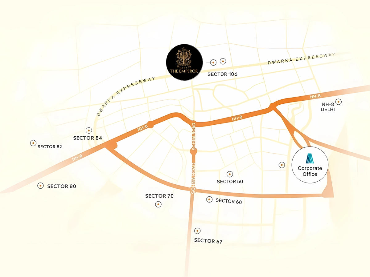 Elan The Emperor is located in Sector 106, Dwarka Expressway, Gurgaon with excellent connectivity to Delhi, IGI Airport, NH-48, and Cyber City.
